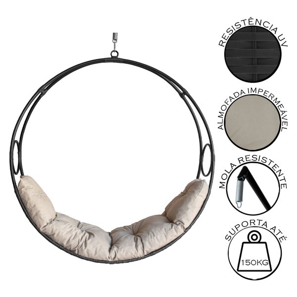 Balanço Suspenso Lua em Corda Náutica com almofada impermeável, mosquetão e mola. Conheça nosso belíssimo Balanço Suspenso! Feito na mais nobre corda náutica e contando ainda com tecido impermeável na almofada.